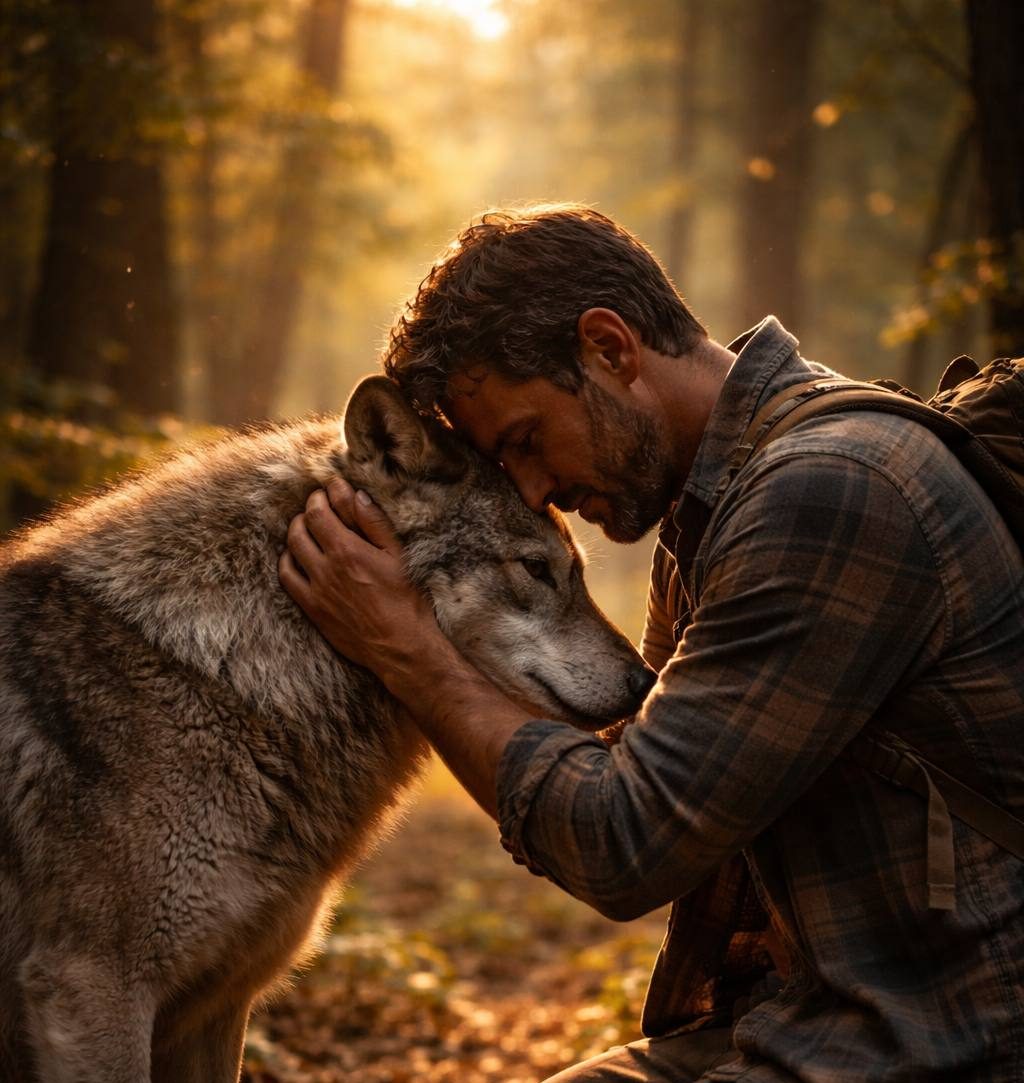 His hand rose, almost trembling, and rested on the wolf’s head.