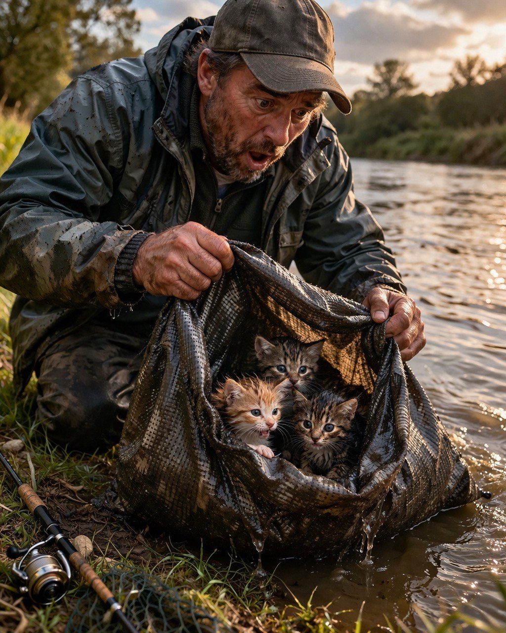 With shaking hands, he slowly untied the wet, dirty rope around the bag.