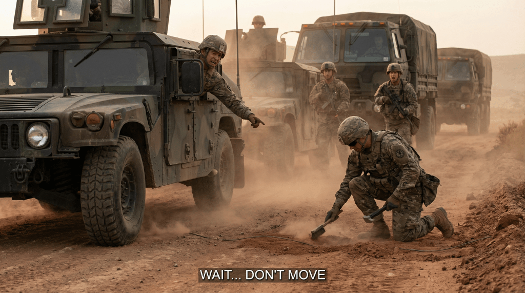 One of the soldiers sat near the back of the vehicle, silently watching the road.